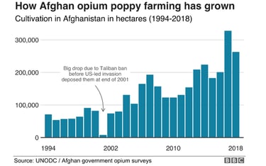 In 2013-2014 and 2016-2018, Afghanistan Poppy cultivation hit surpassed the previous high of 2007. This was reported by the BBC, citing the United Nations Office on Drugs and Crime (UNODC), as shown in the image below.