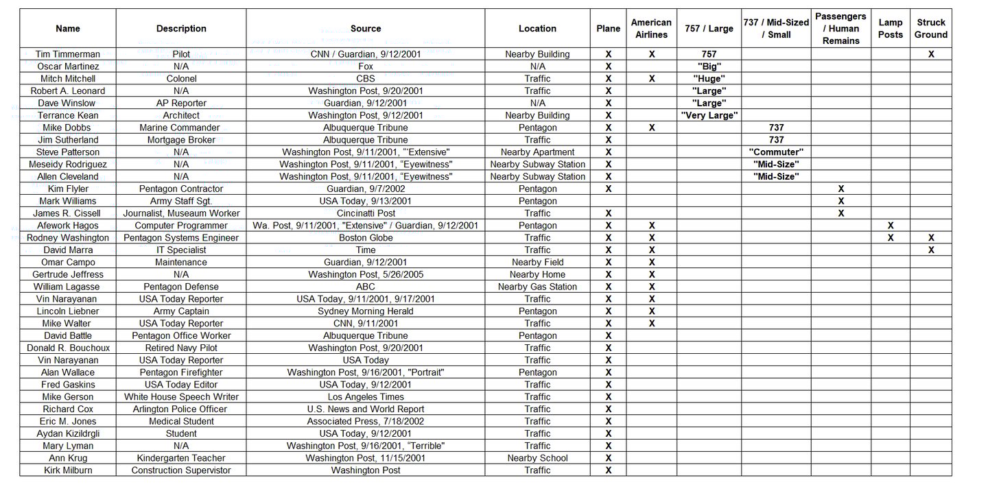 Dozens of eyewitnesses interviewed by mainstream media outlets saw an aircraft strike the Pentagon, with about a dozen of them specifying that they saw an American Airlines logo. A table summarizing many of these accounts is shown on the following page. Two of the witnesses documented in the table said the aircraft clipped lampposts on its approach and three of them said the plane struck the ground just before hitting the Pentagon.